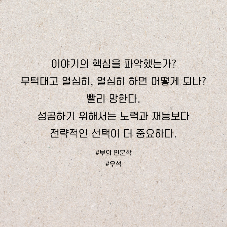 이야기의 핵심을 파악했는가? 무턱대고 열심히, 열심히 하면 어떻게 되나? 빨리 망한다. 성공하기 위해서는 노력과 재능보다 전략적인 선택이 더 중요하다.