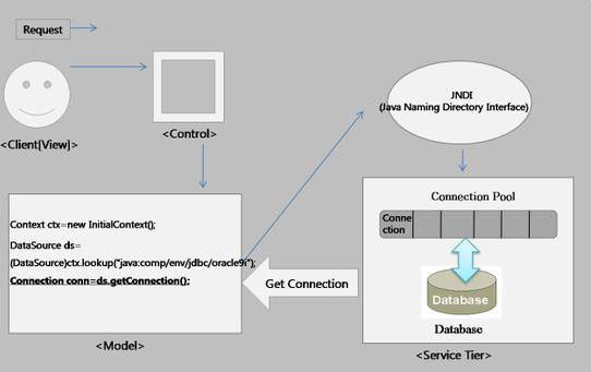 3) Model로 넘어간 요청은 JNDI에 등록된 데이터베이스 객체(Type: DataSource)를 검색한다.