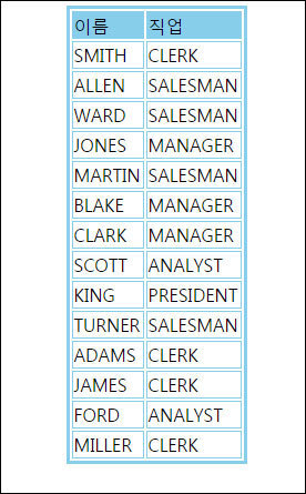 DBtest.jsp를 실행하면 EMP 테이블에서 ENAME와 JOB을 가져와 화면에 출력해준다.