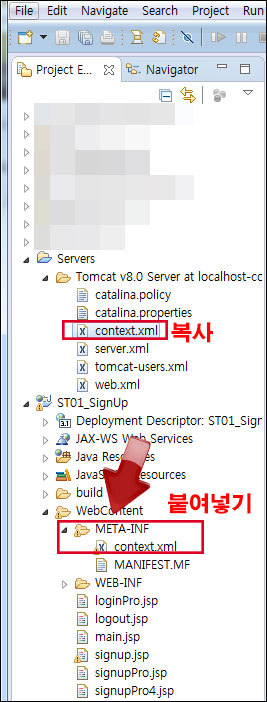 다음으로 할 일은 context.xml을 복사하는 것이다. Servers를 보면 context.xml 파일이 있다. 이것을 복사한다. 그리고 자신의 웹 프로젝트에 d있는 META-INF 폴더에 붙여넣기 한다. 위에는 ST01_SignUp이라는 웹 프로젝트에 META-INF 폴더에 붙여넣기 하였다.