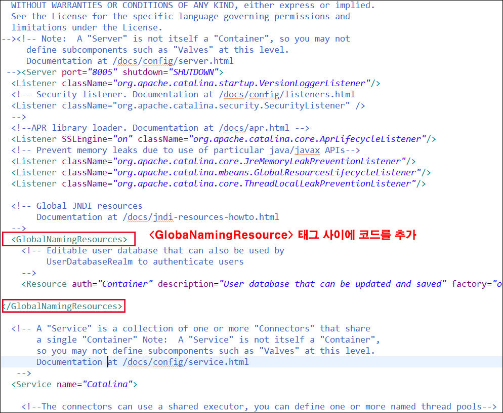 연동을 위해 server.xml에 소스코드를 추가할 것이다. server.xml에 보면 <GlobalNamingResources>라는 태그가 있다.