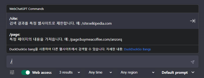 웹스토어의 WebChatGPT 설명글을 확인해보니, 이 외에도 다른 프롬프트 명령어를 추가해서 사용할 수 있다고 합니다.