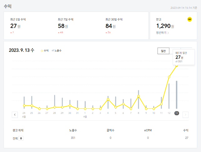 카카오 애드핏 수익. 활발하지 않은 블로그 하루 70명 기준 27원. ^^;