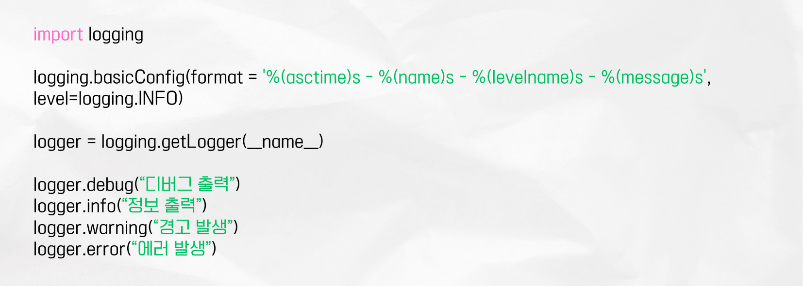 logging.basicConfig(format = "포맷 문자열", level=로그_레벨)