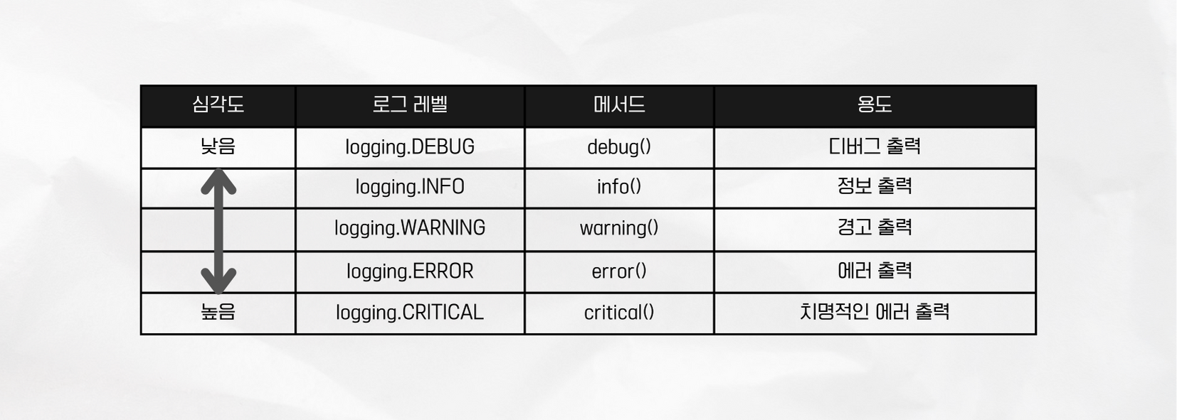 logging모듈은 로그를 출력하는 파이썬 표준 라이브러리다. 로그 출력 시 출력 위치, 포맷, 레벨을 설정할 수 있다.
