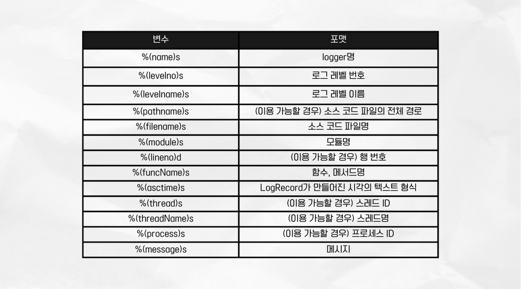 logging.basicConfig(format = "포맷 문자열")
