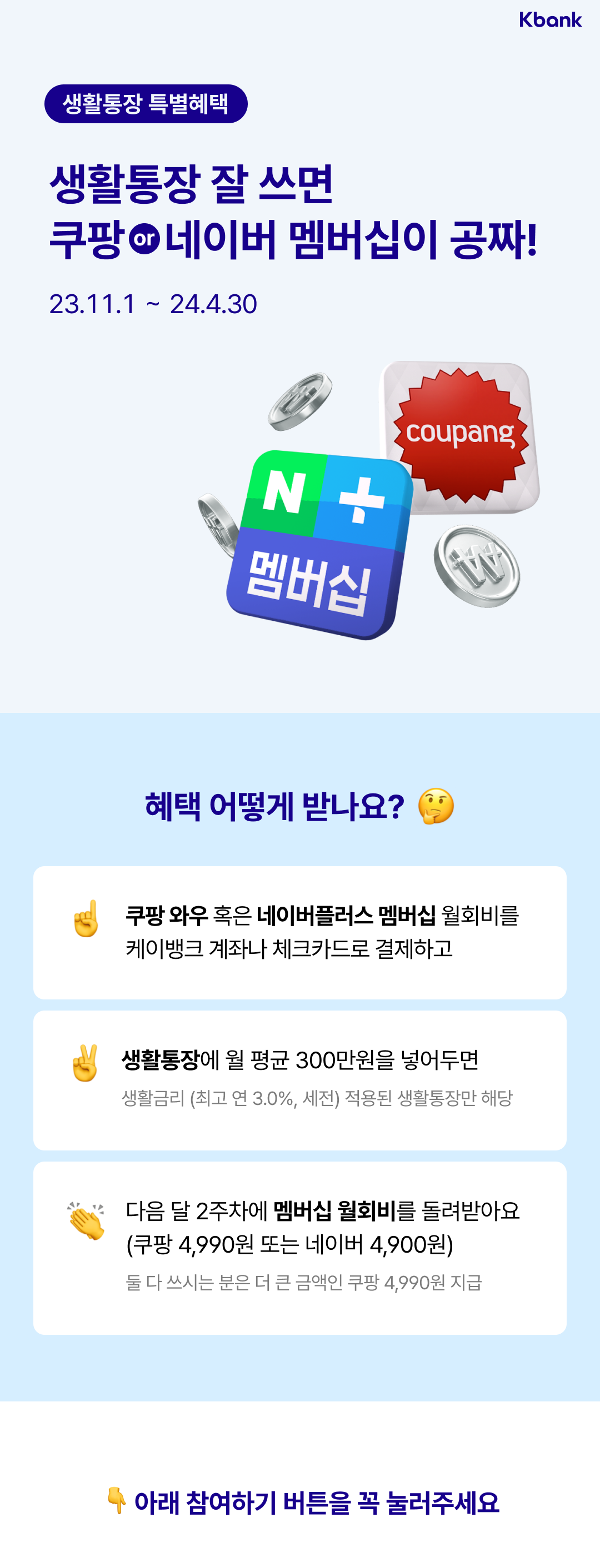 케이뱅크 생활통장에 일정 금액을 넣고, 거기서 쿠팡 와우 이용권 금액이 매달 빠져나가게 하면 된다.
