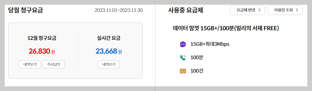 제가 사용하는 데이터 맘껏 15GB+/100분(밀리의 서재 FREE) 요금제는