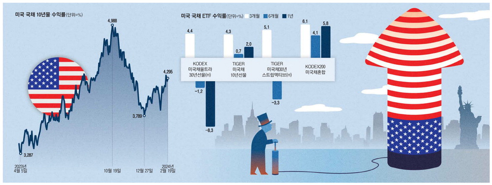 美국채 10년물 수익률 4.3%로↑채권값 상승 베팅한 투자자 늘어한투증권 올들어 4천억원 팔아벌써 작년 판매액 절반 넘어개인이 직접 채권 매입하면매매차익·환차익 비과세 매력ETF는 원화로 살