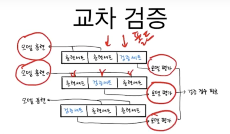 교차 검증은 우선 훈련 세트를 여러 폴드로 나눈 다음, 한 폴드가 검증 세트 역할을 하고 나머지 폴드로 모델을 훈련한다. 그리고 이런식으로 모든 폴드에 대해 검증 점수를 얻어 평균한다.