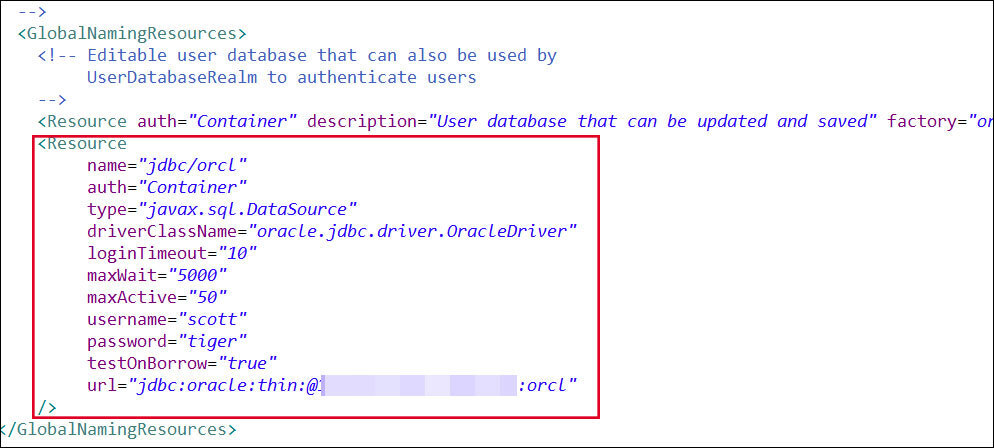 위 코드를 보면 name="jdbc/orcl"로 되어있다. 여기서 jdbc/뒤에는 사용자가 임의로 지정하면 된다. 만약 뒤에 test로 하고 싶다면name="jdbc/test" 이렇게 해주면 된다. 그리고 URL 부분에 IP 주소를 보자. 자신의 PC에 오라클이 설치되어 있다면 IP 주소에 localhost로 적으면 된다. 이 부분에 대한 자세한 설명은 아래 링크를 참고하면 된다.